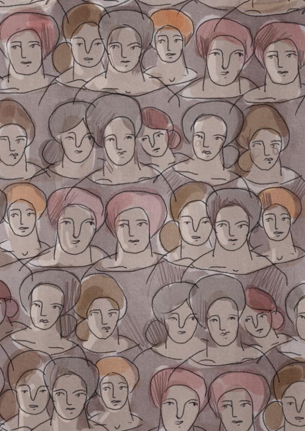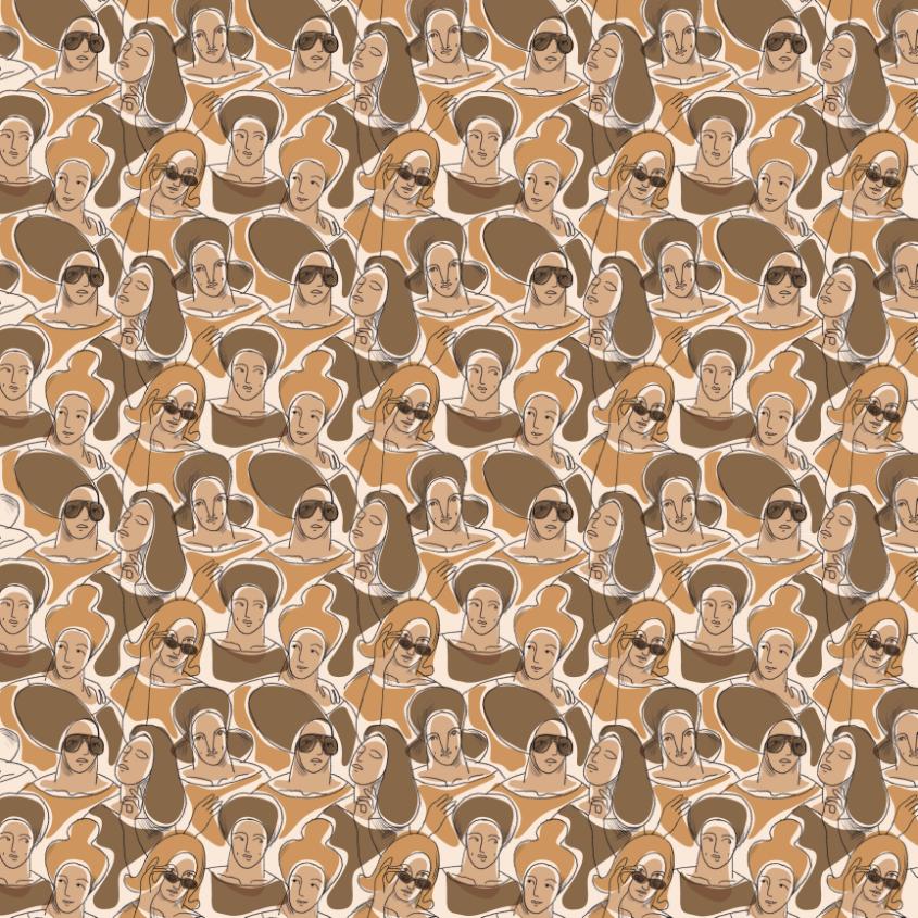 Mønsteret er bygget opp av individuelle former som oppløses i et mykt, kamuflasjeinspirert uttrykk. Her er kamuflasjebegrepet nytolket – ikke som noe forbundet med konflikt, men som et bilde på tilhørighet og beskyttelse, der flere elementer smelter sammen til en helhet. Resultatet er et organisk, rolig og menneskenært uttrykk.